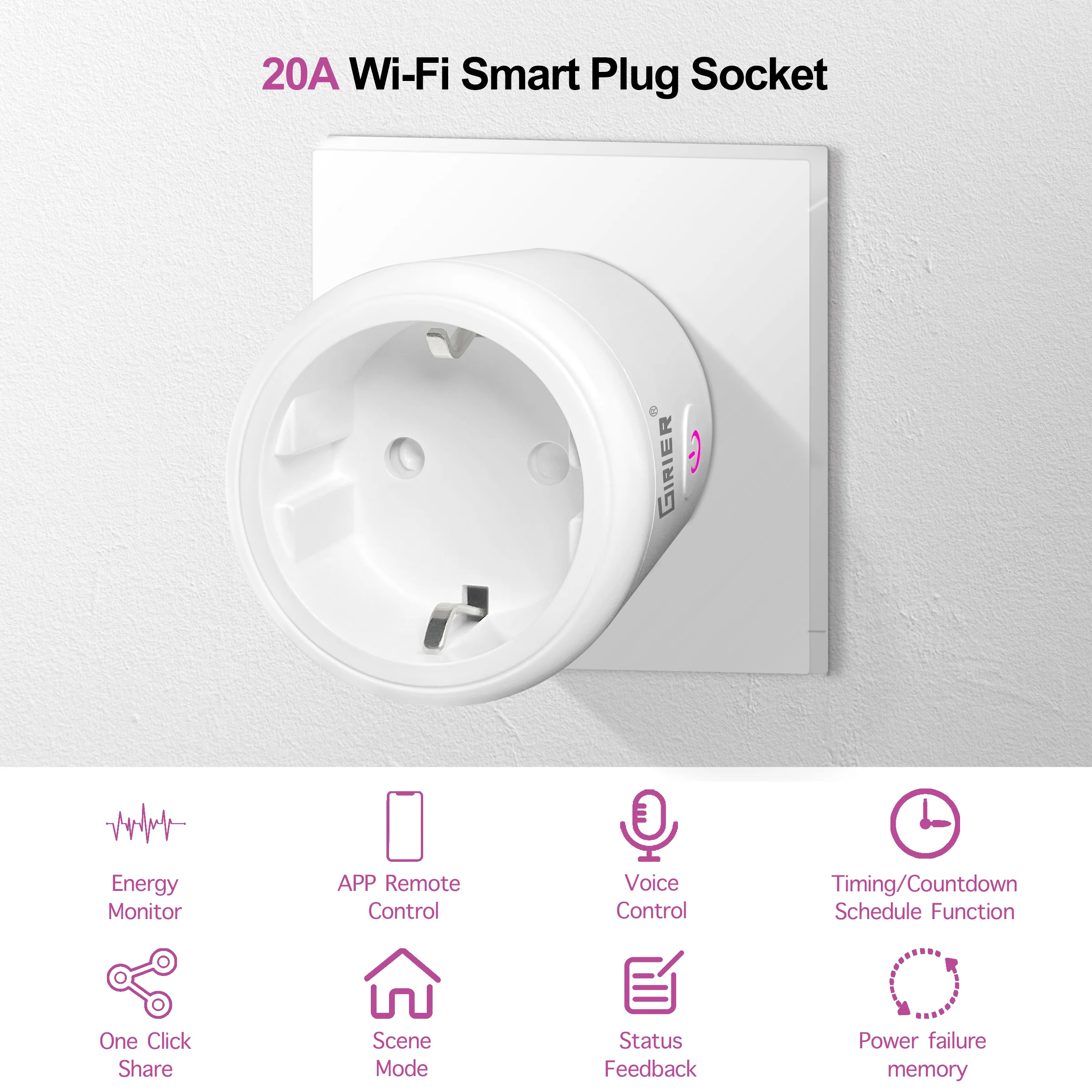 20A Tuya Wifi Smart Plug EU by GIRIER with Power Monitor Function Smart Life App Remote Control Socket Outlet Works with Alexa Google Home Yandex Alice