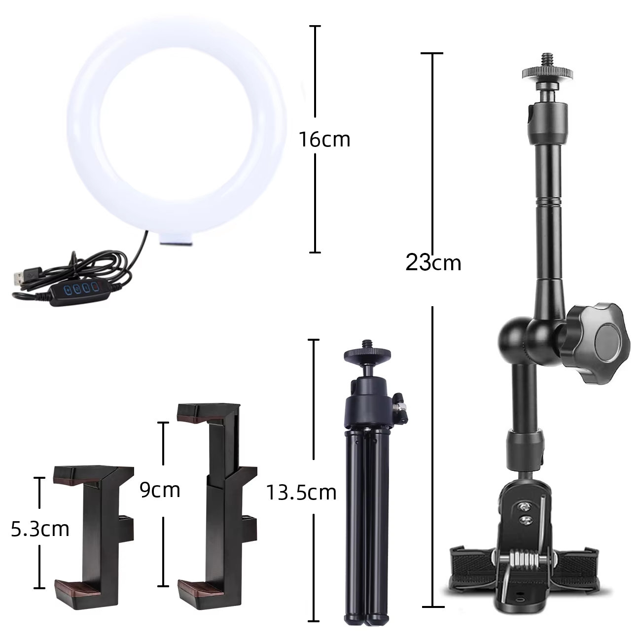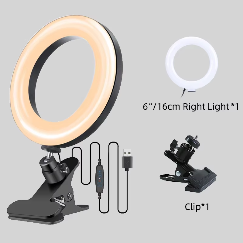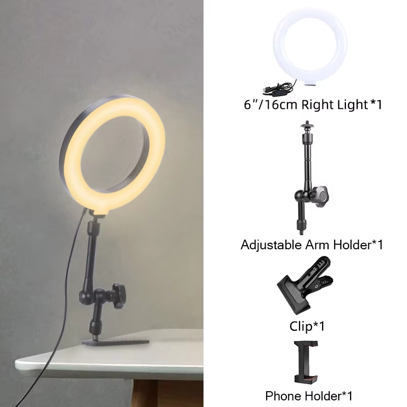 【Mounting Clamp & Support Arm】The anti-scratch mounting clamp (Max Mouth Opening Size: 4.5 cm) allows this ring light to be mounted on your desk, laptop, chair, bed, conference table and anywhere you like. And the flexible support arm is easy to adjust position.