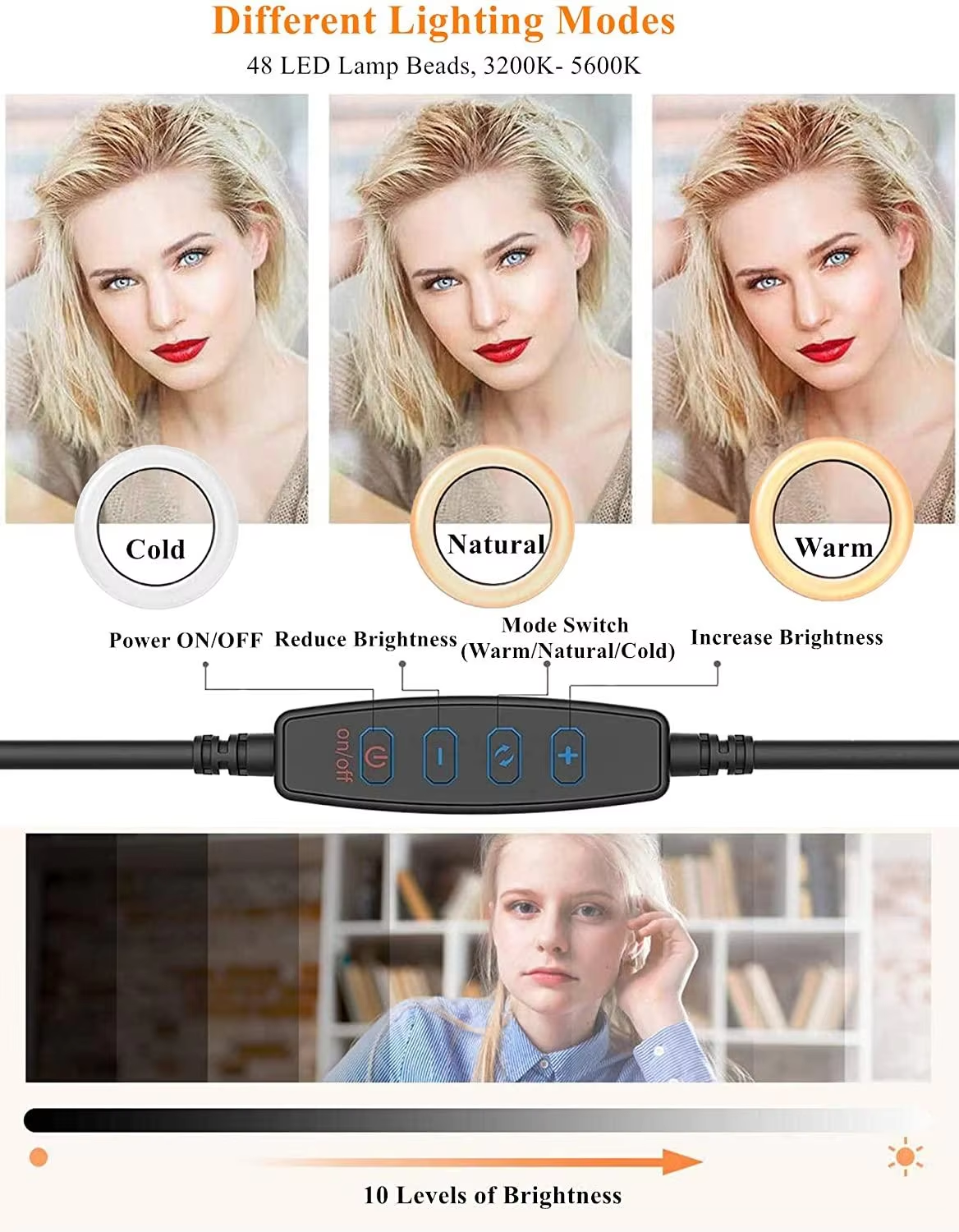 【Adjustable Brightness & Color】LED ring light has 3 light colors – warm, warm white, white. Each lighting mode has 10 different brightness. The color temperature is adjustable from 3200K (Warm) – 5600K (Cool).